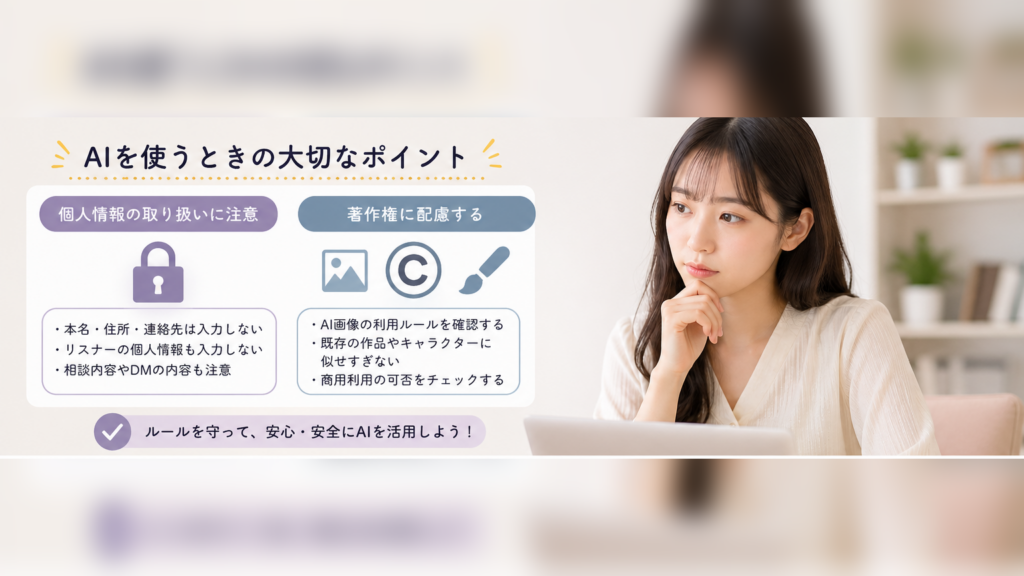AIはとても便利なツールですが、使い方を少し間違えると、思わぬトラブルにつながる可能性もあります。とはいえ、難しく考える必要はありません。いくつかのポイントを押さえておくだけで、安心して活用することができます。今回は、配信者がAIを使ううえで知っておきたい基本的な注意点をまとめました。